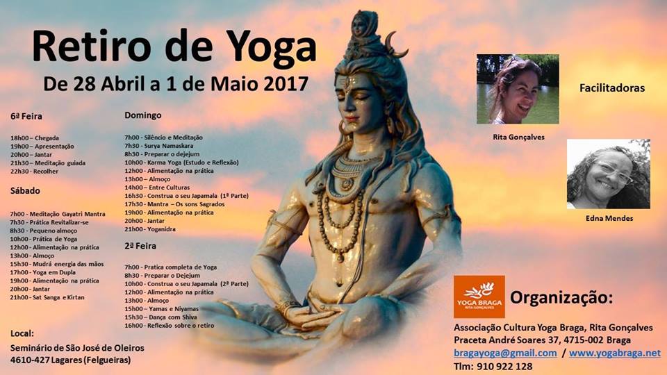 Proponha-se a um retiro diferente, longe dos barulhos do mundo exterior, do excesso de stress e da rotina instalada. Será um fim de semana dedicado a si e para si, em contacto com a natureza, vivenciado em práticas milenares de yoga. Um fim de semana de vivências, no caminho da expansão da consciência e purificação interior. Retiro aberto a associados do Yoga Braga e não associados. Os sócios do Yoga Braga, usufruem de 10% de desconto, sobre as atividades. |